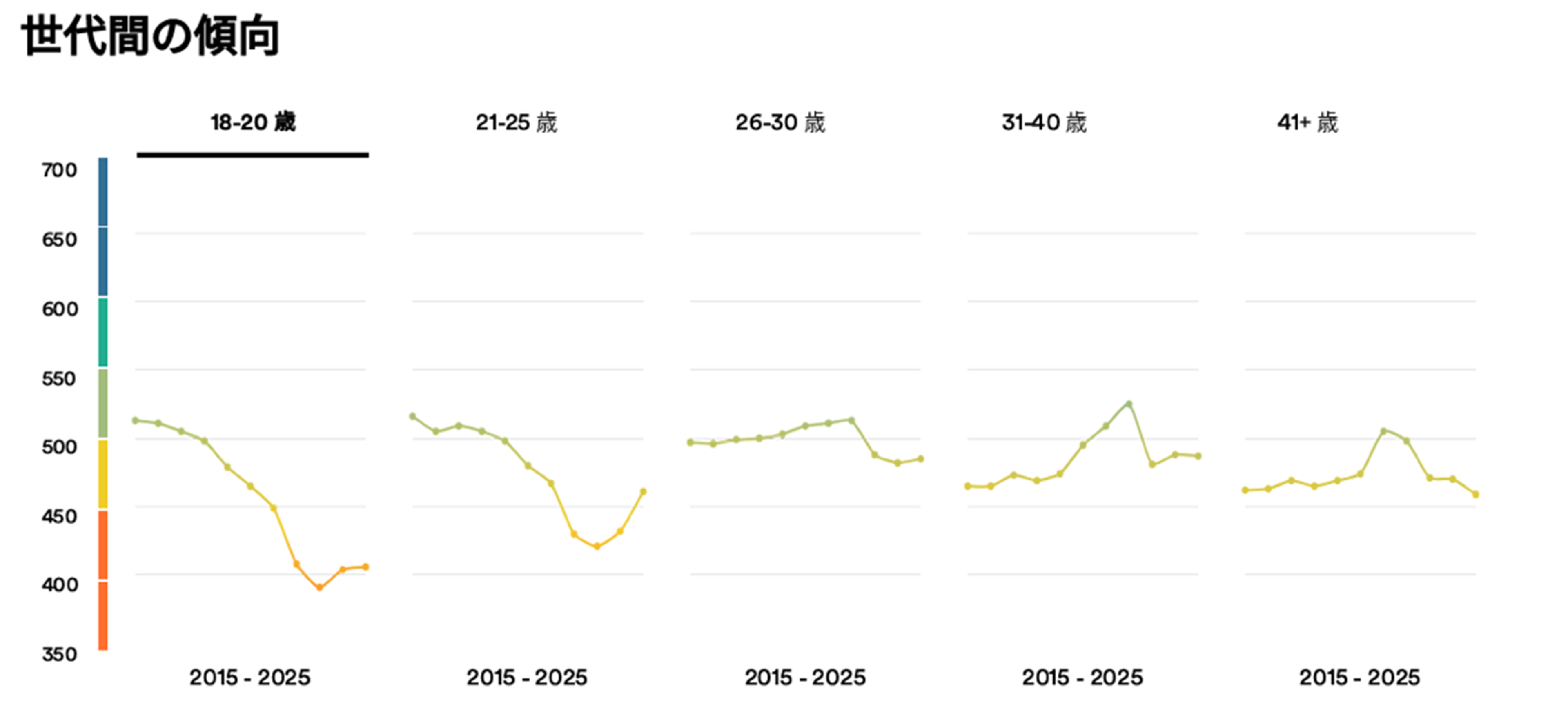 若年層(18〜25歳)が全世代で最もスコアが低く、AI学習やオンライン授業へのアクセス格差も影響か?