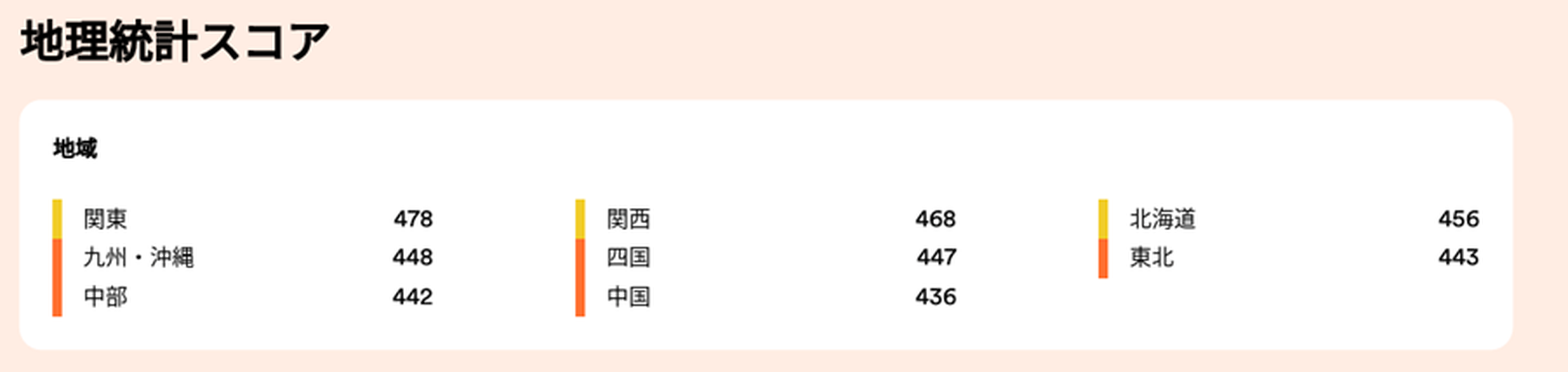 地域別では関東(478)が最高、中国地方(436)が最低。都市と地方で40ポイント超の差が発生
