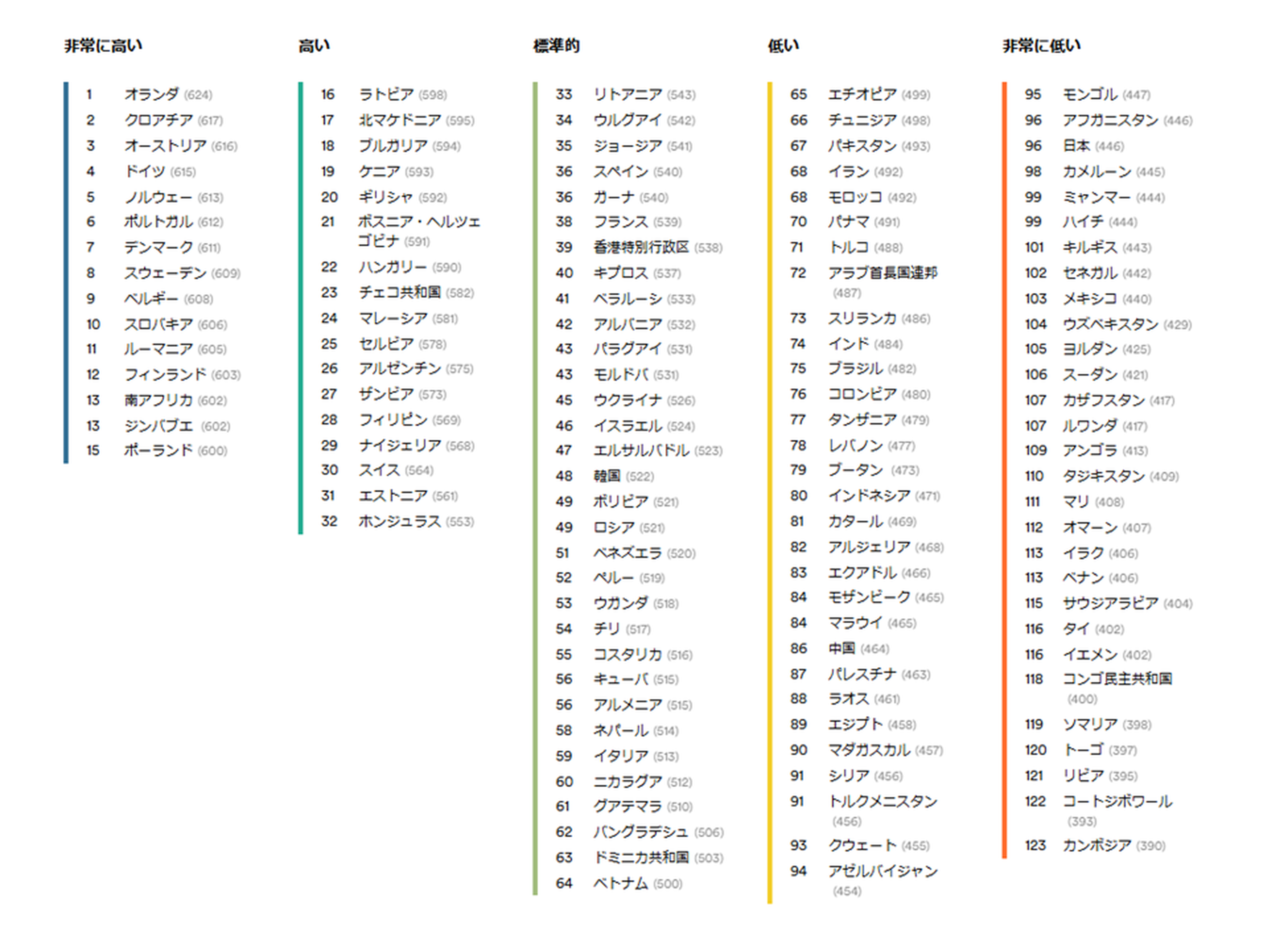 日本は96位(スコア446)と、アジア平均(477)および世界平均(488)を下回る結果に